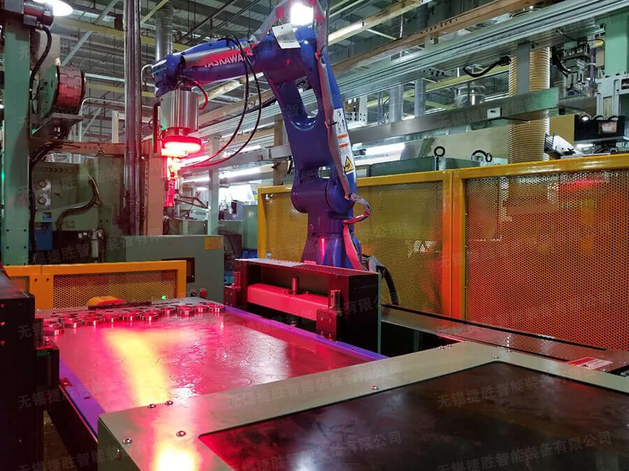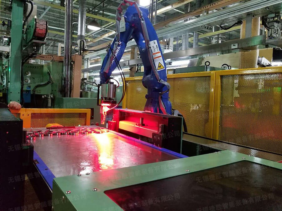 1,通過(guò)機(jī)器人配合機(jī)器視覺(jué)引導(dǎo)定位,對(duì)不同外徑的軸承外圈進(jìn)行抓取上料